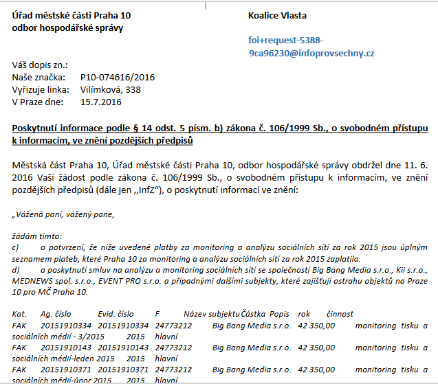 Soutěž na kampaň vyhrála společnost Media:list s.r.o., jejímž společníkem byla do roku 2018 agentura Big Bang Media s.r.o. Firma, která byla jednou z těch agentur, které pro Prahu 10 před komunálními volbami v roce 2018 prováděly známý monitoring sociálních médií, viz obrázek níže.