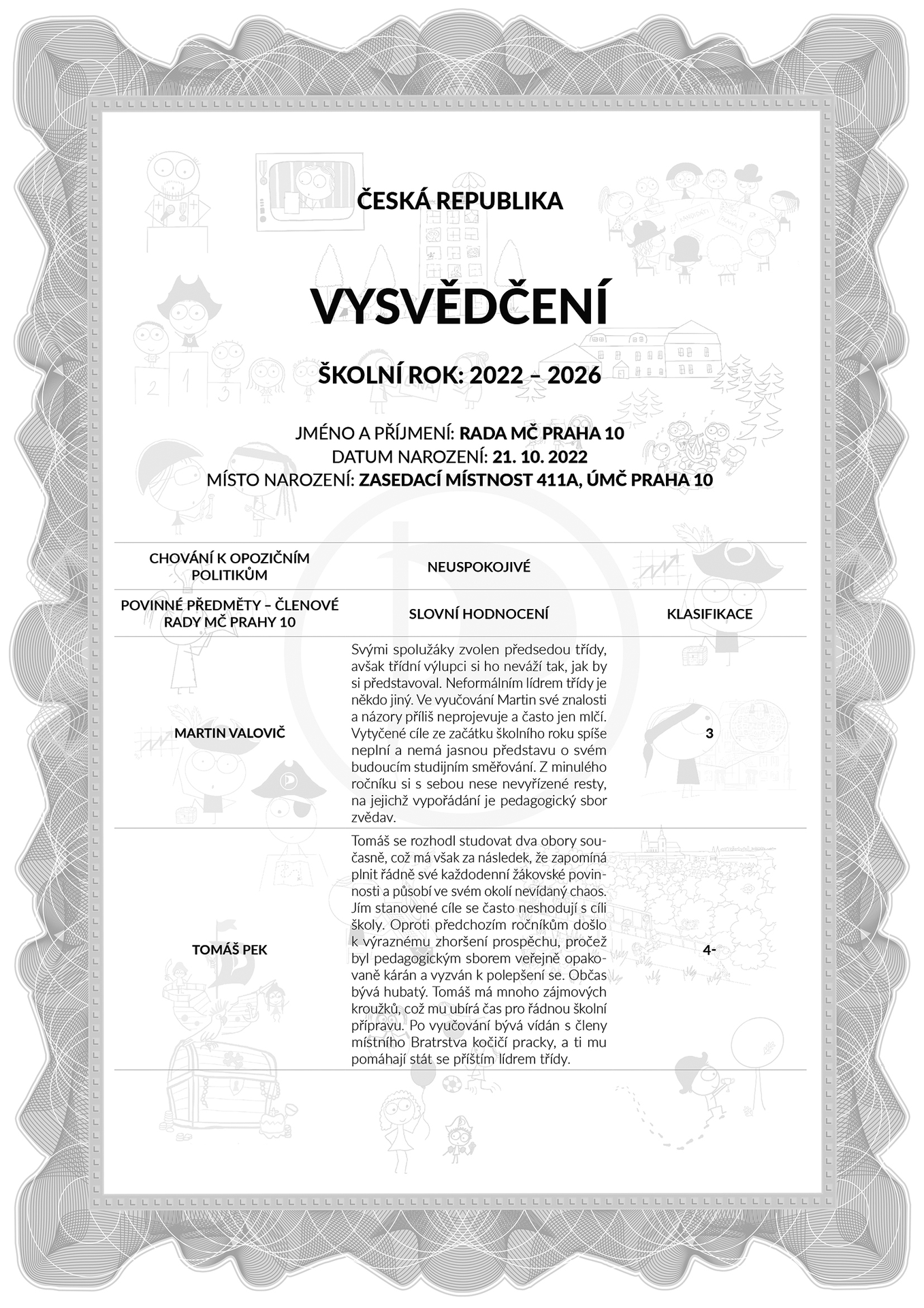 Na klasifikační konferenci hodnotil pedagogický sbor třídní kolektiv Rady MČ Praha 10 ve školním roce 2022/ 23 z hlediska akivity ve výuce, z pohledu přípravy do hodin, chování, zájmového seberozvoje, sebeprezentace či absence.